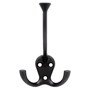 Product Description : From the ManufacturerThis hook offers maximum storage thanks to three separate hooks allowing for increased storage capacity. Finished in Flat Black with a flared top for additional design appeal, this hook is will coordinate with most existing decors will last for years to come. Great for use in bedrooms, bathrooms, and closets. Holds a maximum weight of 35 lbs when mounted to solid wood or studs.